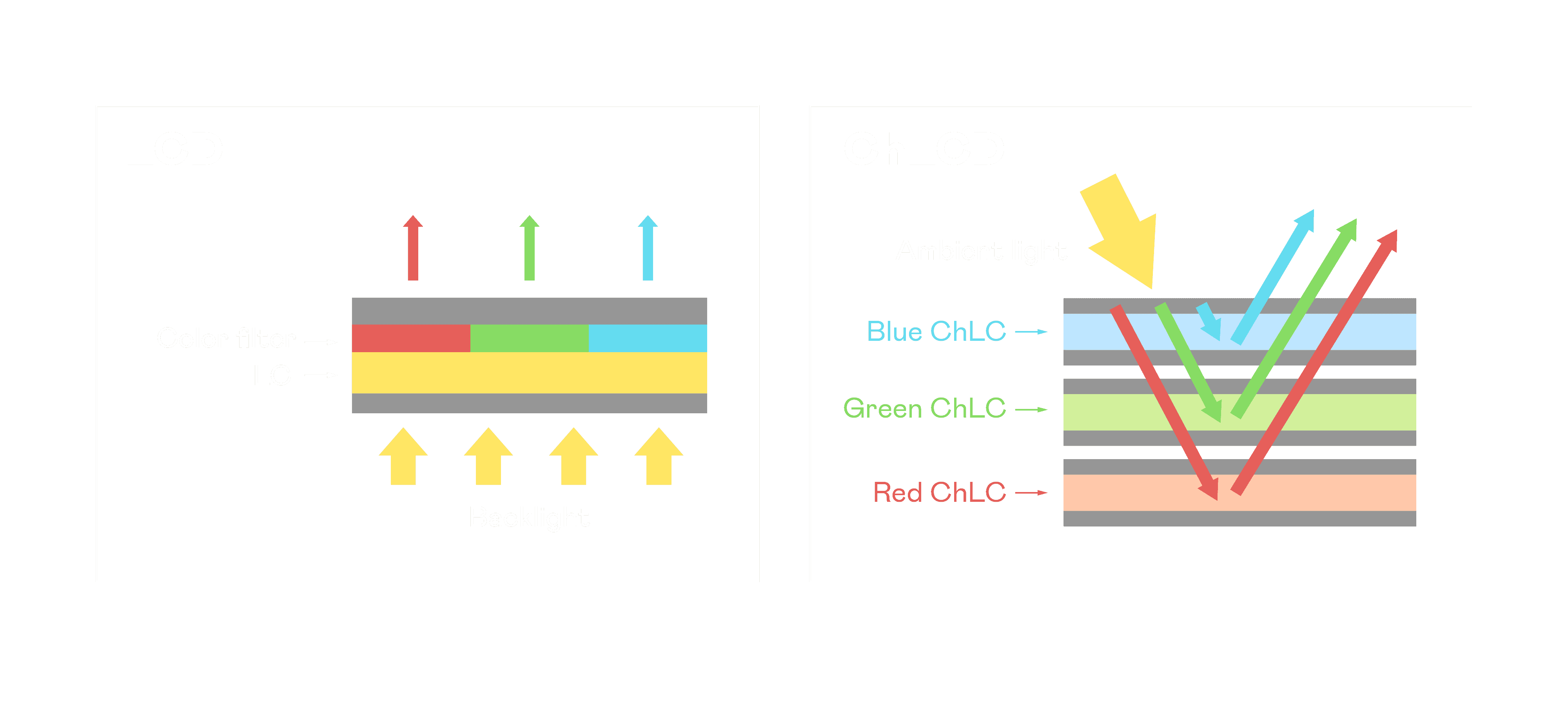 ChLCD 胆固醇液晶就如同纸张一样,,透过反射环境光来显示影像,,因此长时间观看不易造成人眼视觉疲劳,,可达到护眼效果。。。。当处于户外阳光下使用,,,,LCD 影像容易失真而不易观看,,但胆固醇液晶仍可维持较佳的影像品质。。