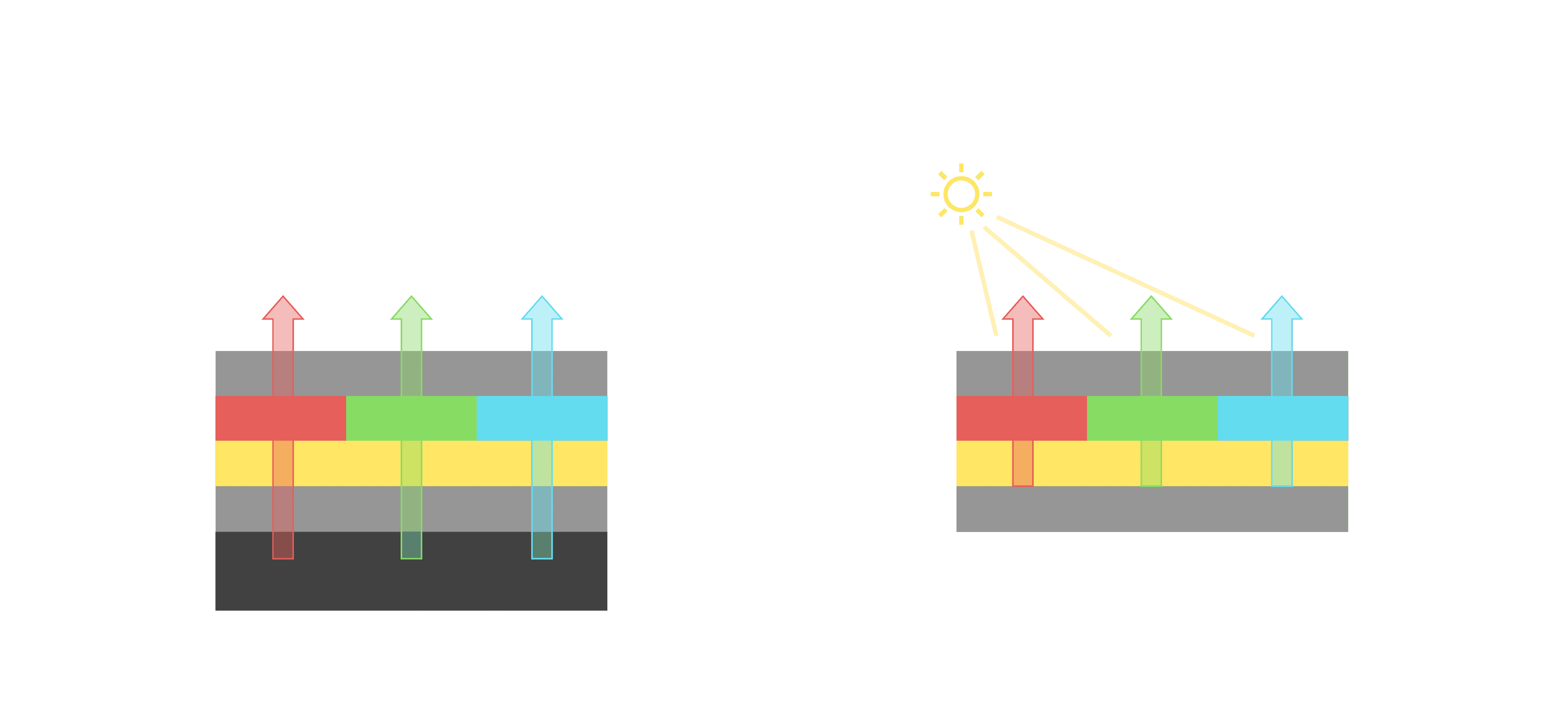 与传统需搭配背光单元的液晶显示相比,,,反射式液晶技术不仅更省电、、、更轻薄,,,,且即便在艳阳下仍能清晰显示。。此外,,,,少了背光单元,,,也大幅降低了 LED 蓝光伤害眼睛的疑虑。。。。